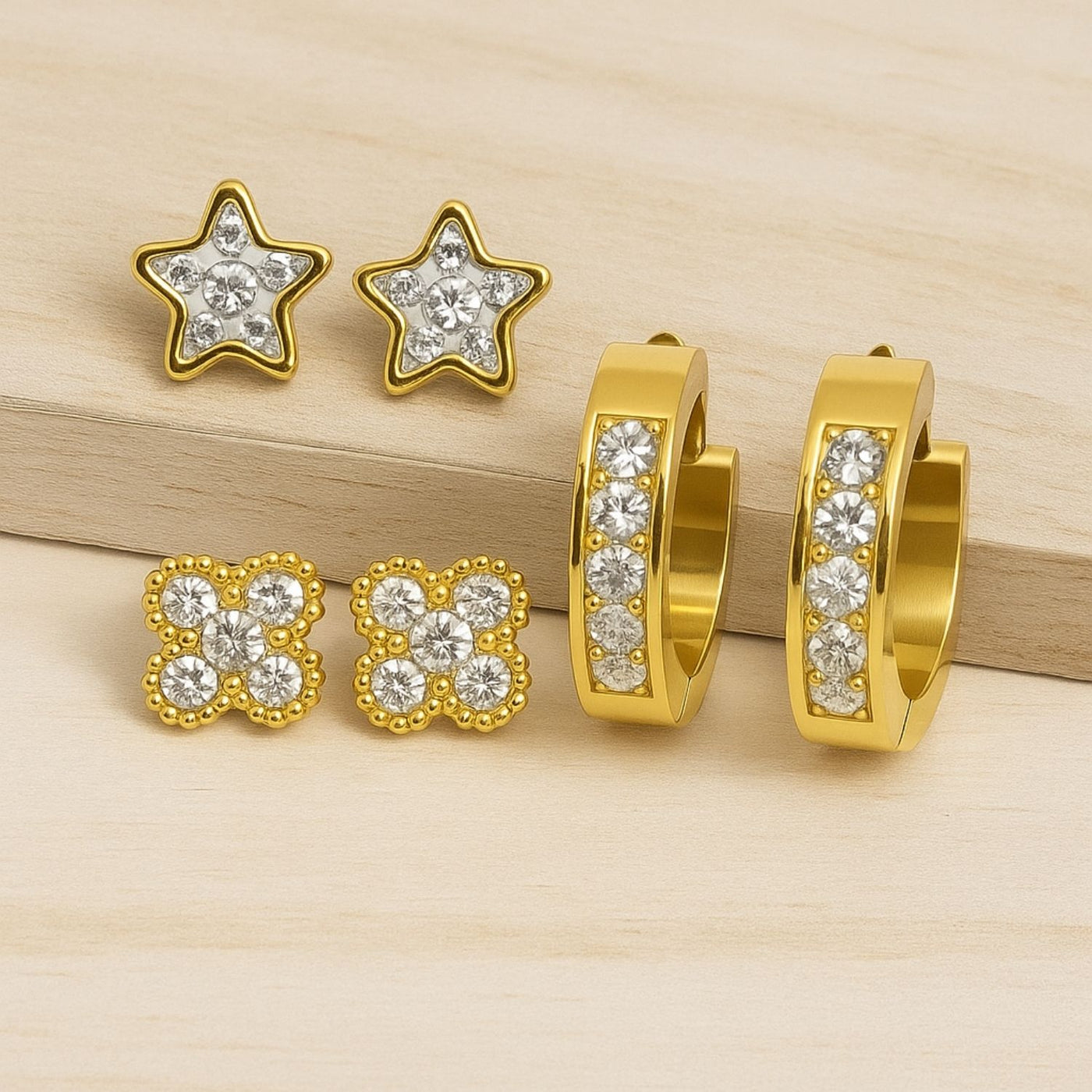 This elegant 3-pair combo features crystal-studded stars, floral studs, and gold huggie hoops — perfect for everyday sparkle or stylish layering.