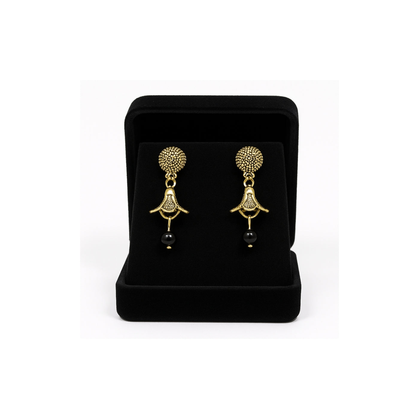 Enhance your ethnic and everyday style with these elegant gold-tone floral earrings featuring a delicate black bead drop. Designed with beautiful detailing and a traditional motif, these earrings offer a perfect blend of simplicity and sophistication. Their lightweight build ensures comfort throughout the day, making them ideal for daily wear, festive occasions, office outings, or family gatherings.