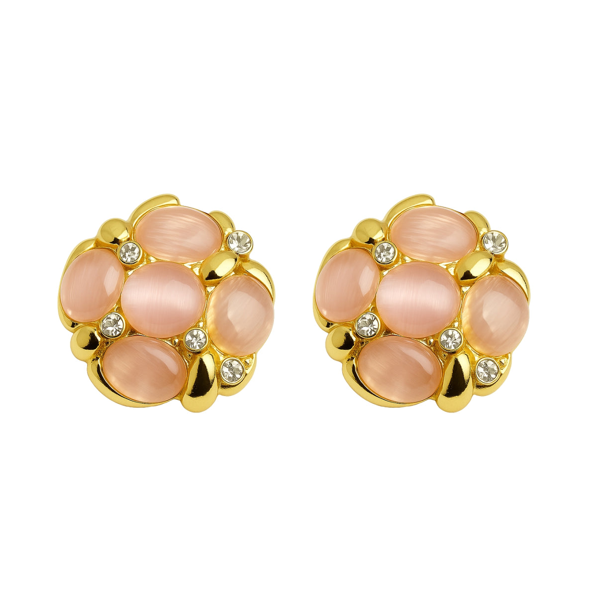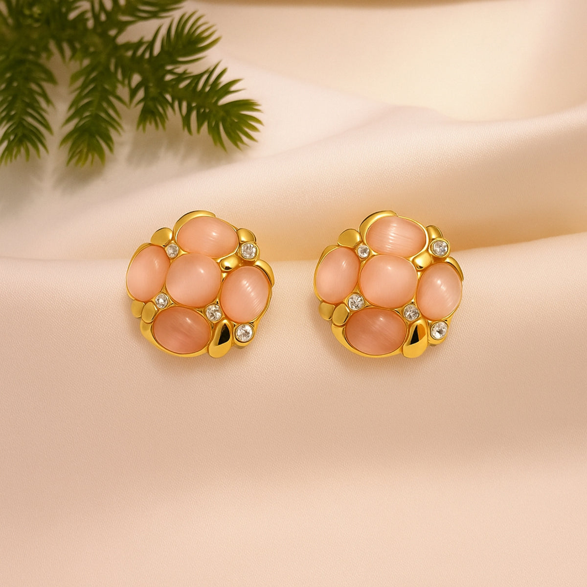Women’s Blush Cat-Eye Cluster Stud Earrings – Gold-Tone Floral Round Studs with Pink Cabochons & Sparkle Crystals, Lightweight Push-Back (Pair)