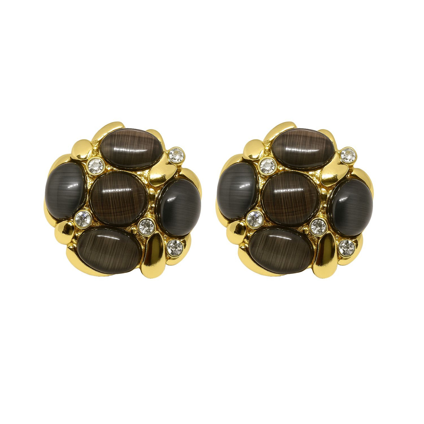 Women’s Blush Cat-Eye Cluster Stud Earrings – Gold-Tone Floral Round Studs with Pink Cabochons & Sparkle Crystals, Lightweight Push-Back (Pair) - Black