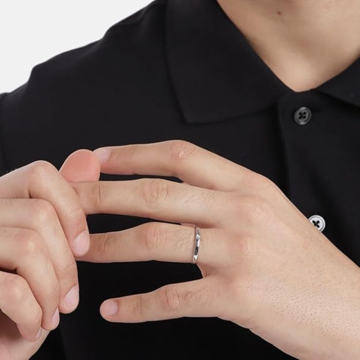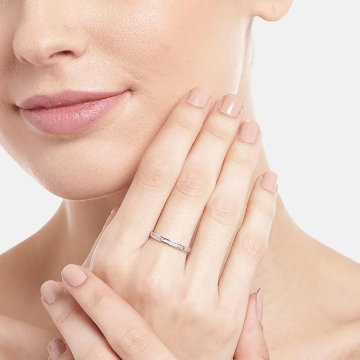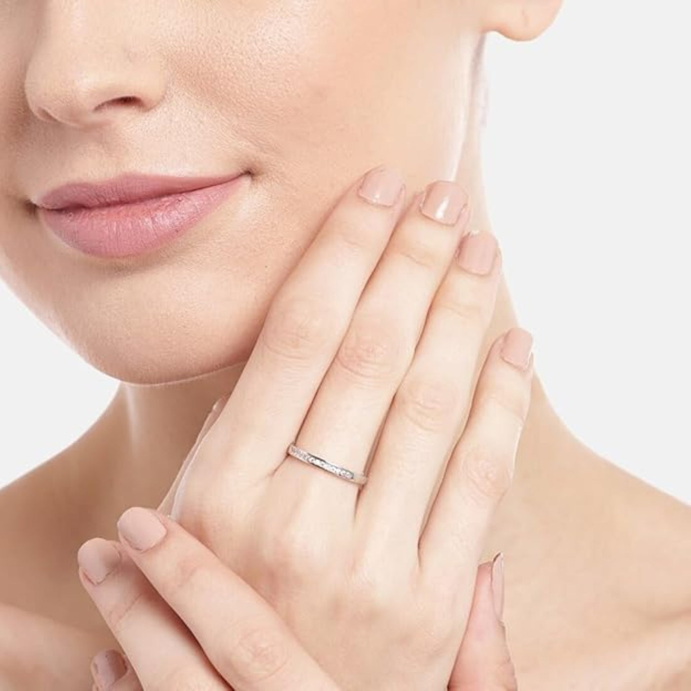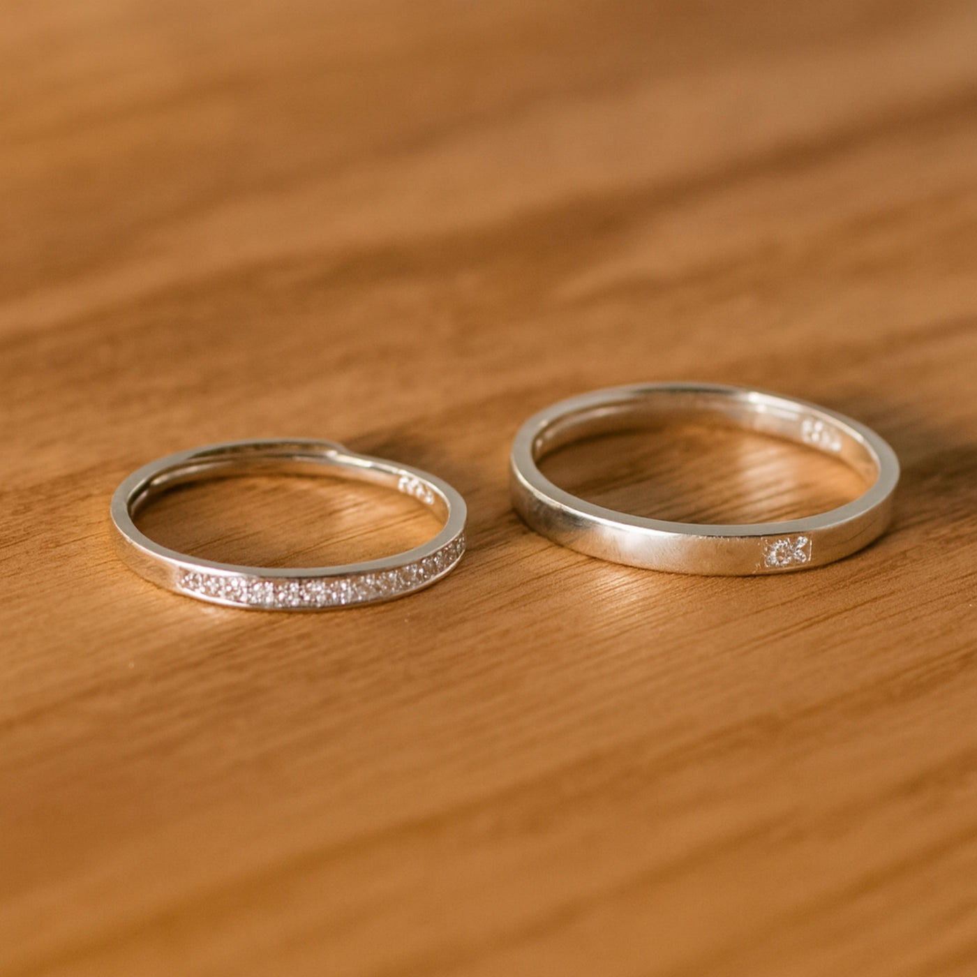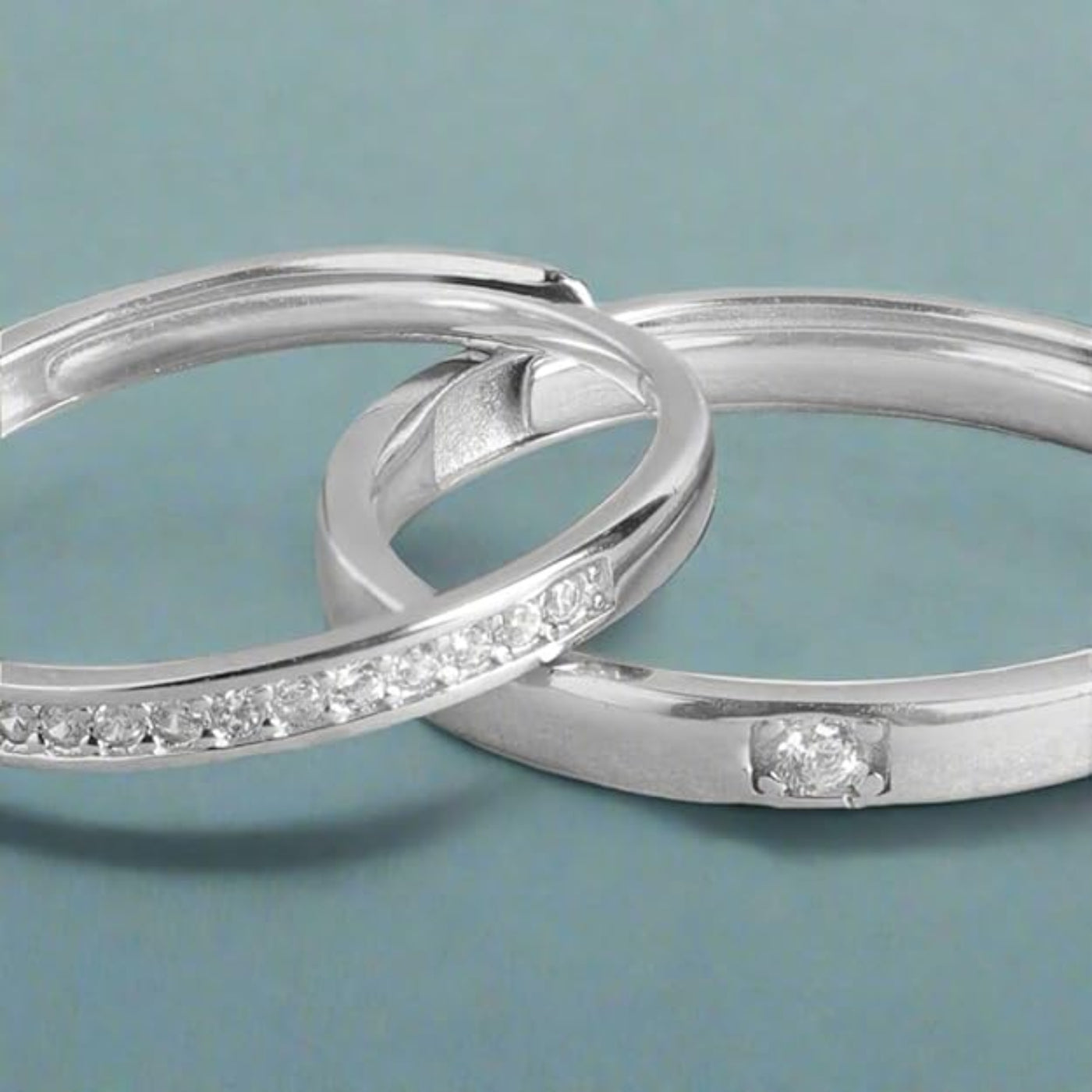 This coordinated couple set blends classic and modern. The women’s ringshowcasesa luminous round CZ in a secure prong setting, while the partner band features a neat row of channel-set stones for subtle shine. Both pieces are crafted in a bright silver-tone finish that pairs effortlessly with any outfit.