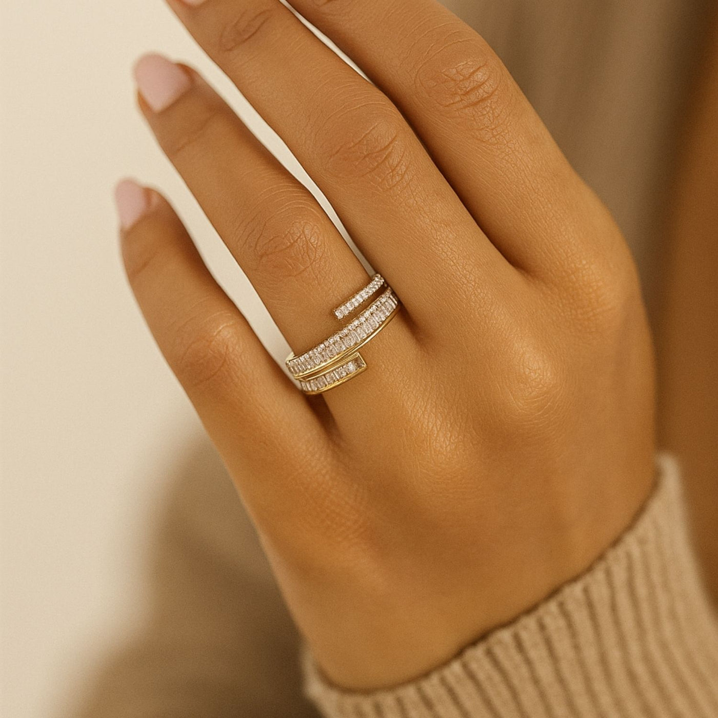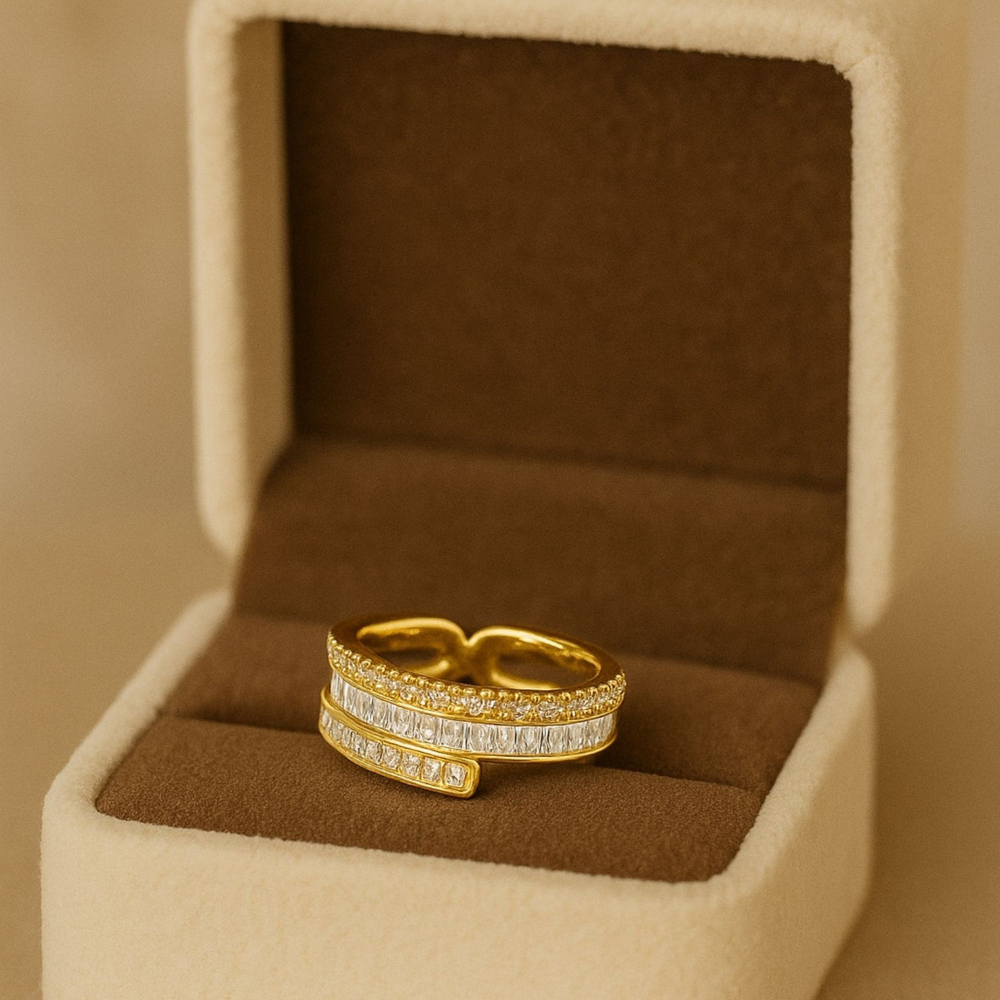 Gold Double Row Crystal Ring – Baguette-Cut Adjustable Cocktail Ring for Women & Girls