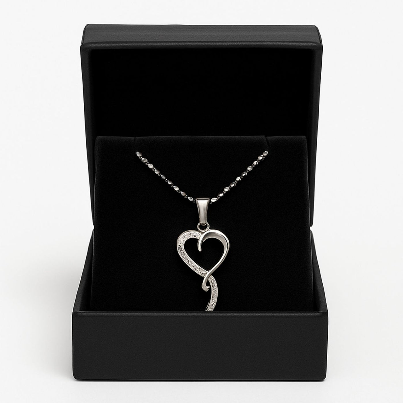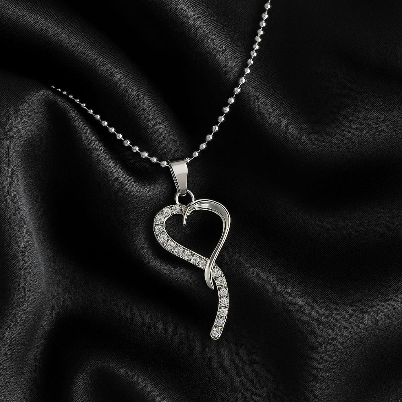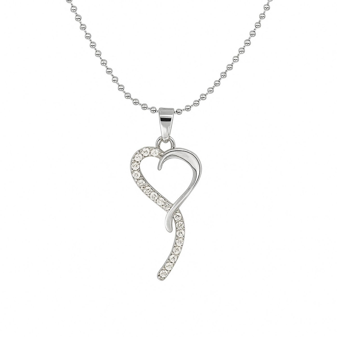 Elegant and unique, this twisted heart pendant with embedded crystals captures the essence of love in a sleek silver finish.