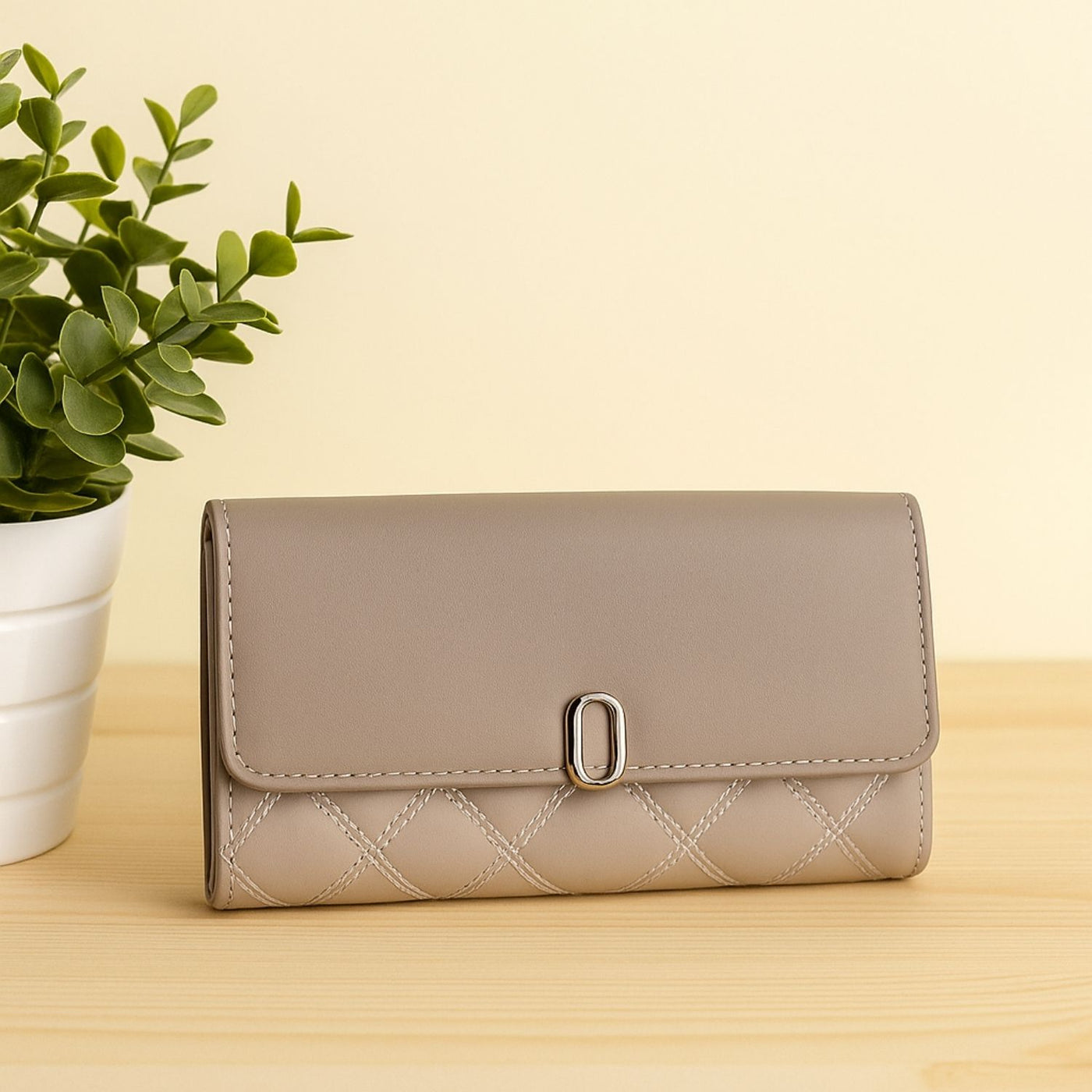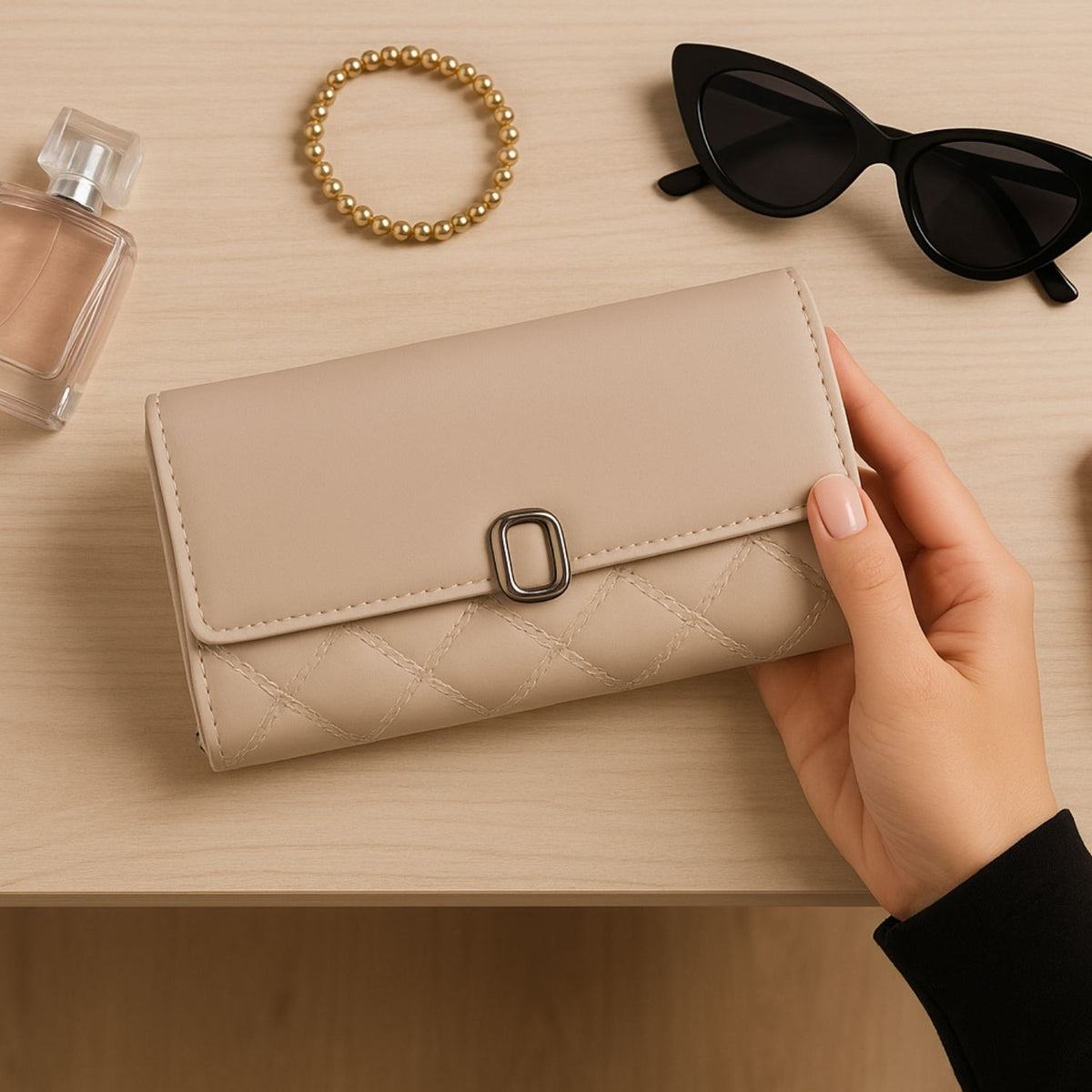 A sleek and spacious beige wallet with quilted detailing, crafted for elegance and everyday use. Comes in a charming pink gift box.