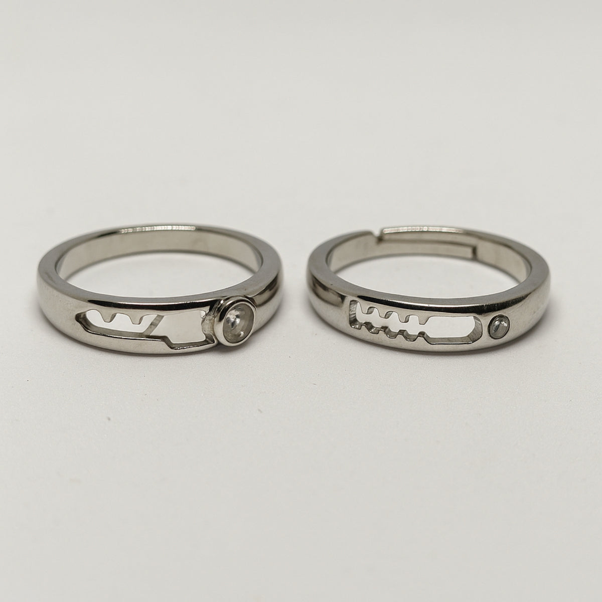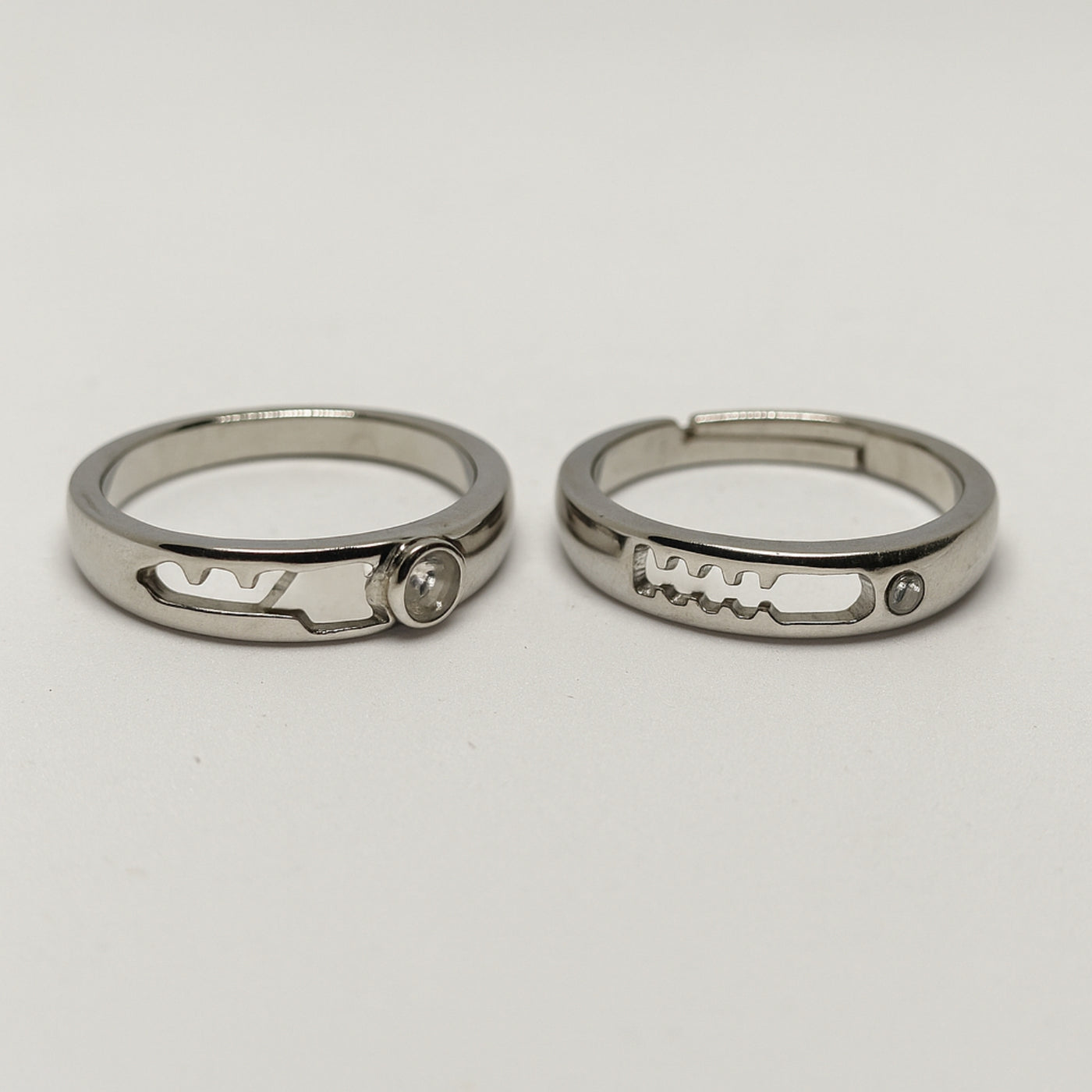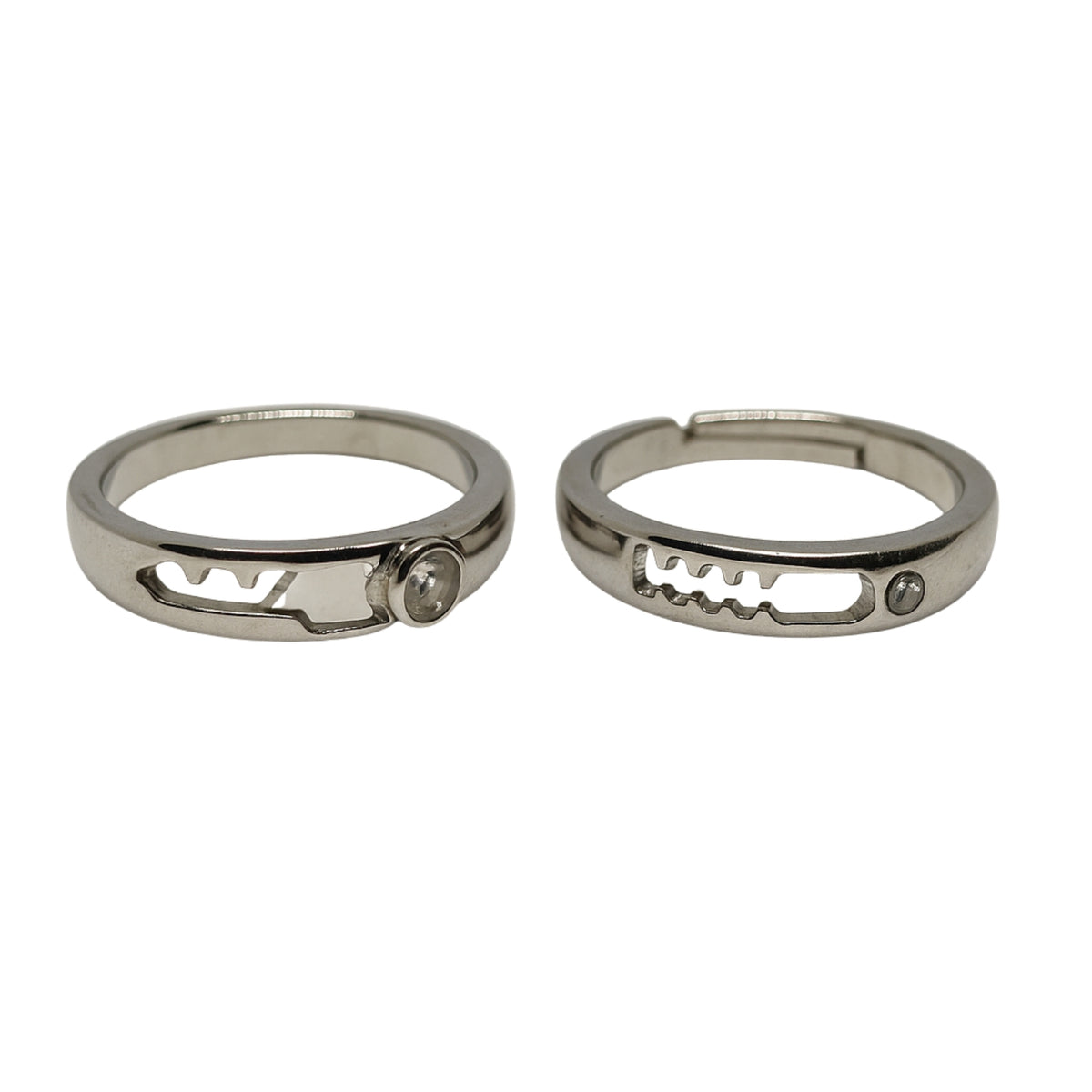 Celebrate your connection with this matching couple ring set. Each ringshowcasesa sleek, high-polish silver tone and an open, adjustable band for a comfortable fit. The design highlights a romantic “key & heart” motif—symbolizing that you hold the key to each other’s hearts—while a handset cubic zirconia adds a tasteful sparkle. Lightweight yet sturdy, these rings are easy to wear every day, whetheryou’redressing up for date night or keeping it casual. A thoughtful gift for anniversaries, proposals, Valentine’s Day, or just because.