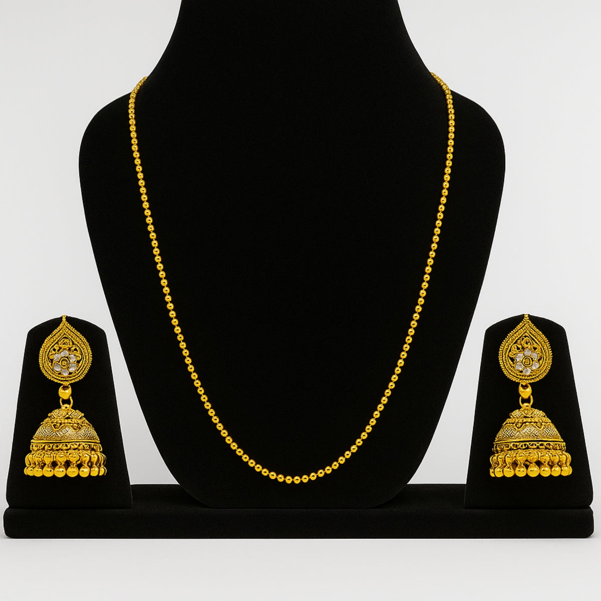Elegant jewellery combo featuring a gold-plated beaded chain necklace and matching traditional jhumka earrings — perfect for festive & cultural occasions.