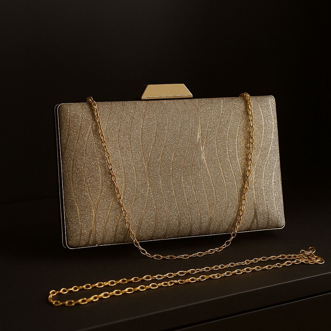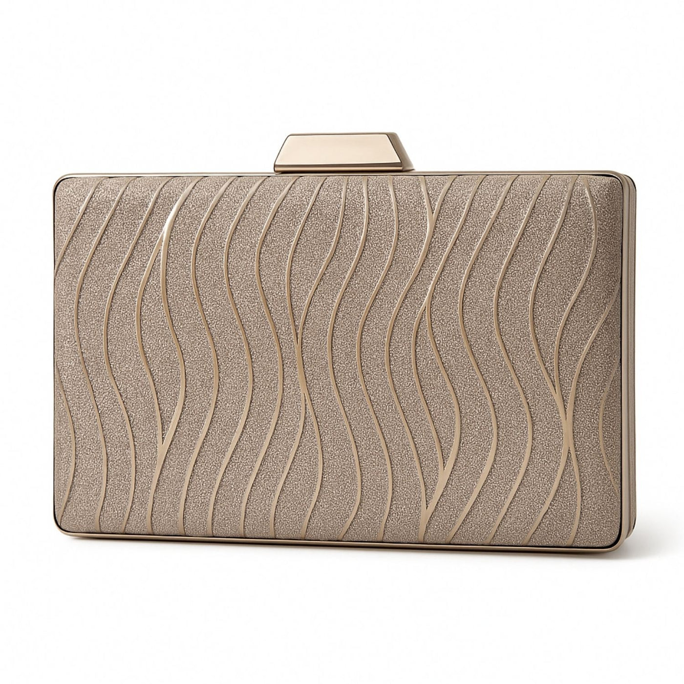A stunning rectangular clutch featuring a vertical shimmer texture in champagne gold – perfect for weddings, parties, and evening glam.