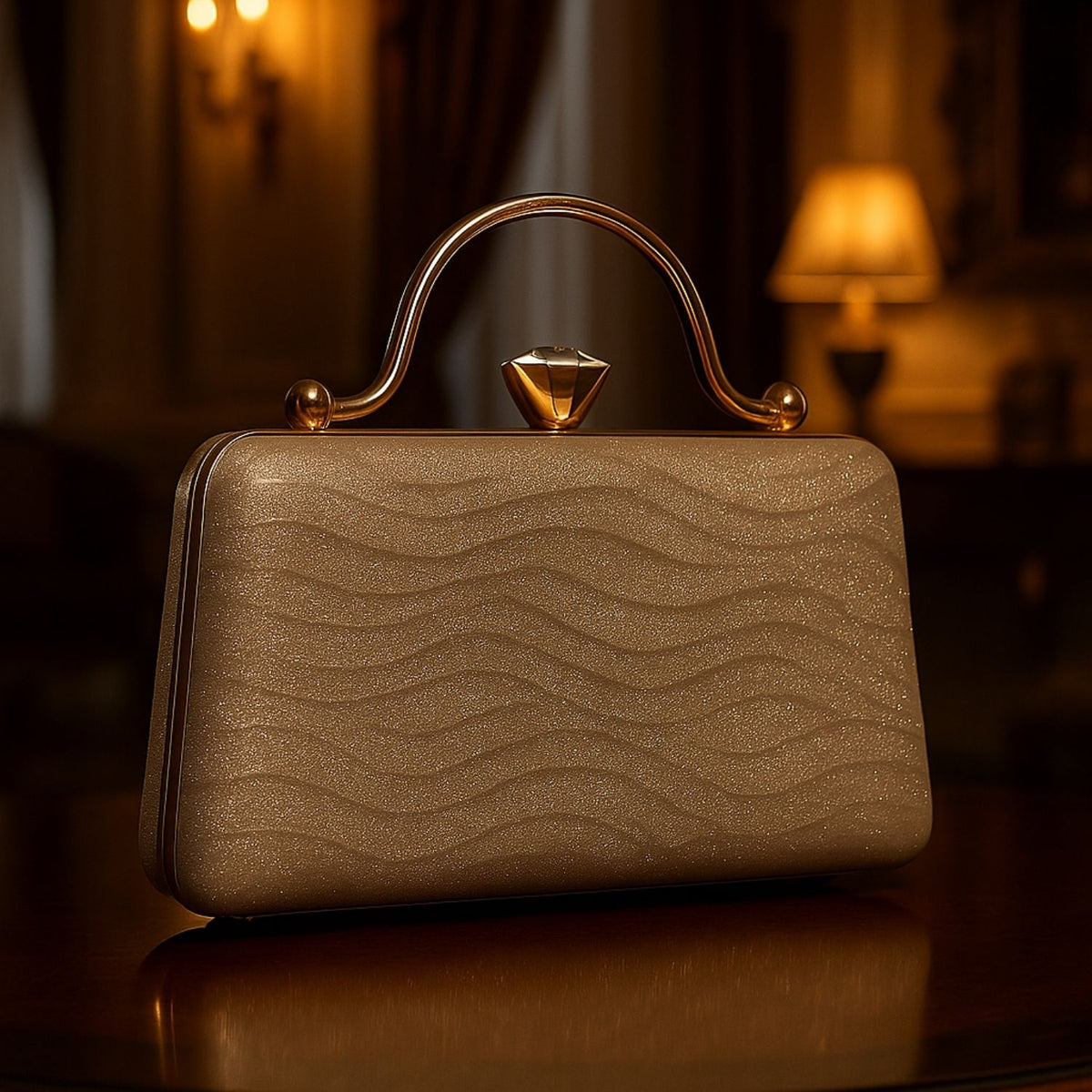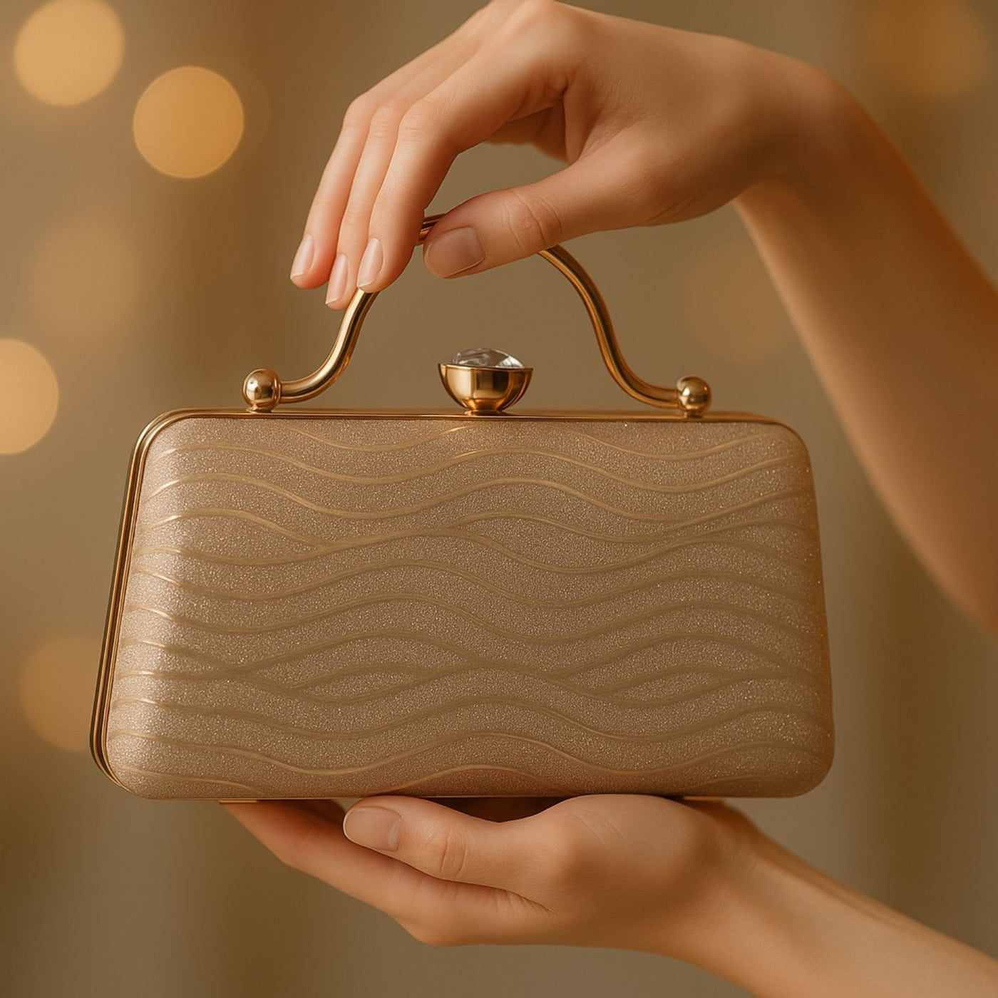 Shimmer in style with this golden glitter clutch, featuring a curved metal handle and crystal clasp – perfect for weddings, parties, or festive evenings.