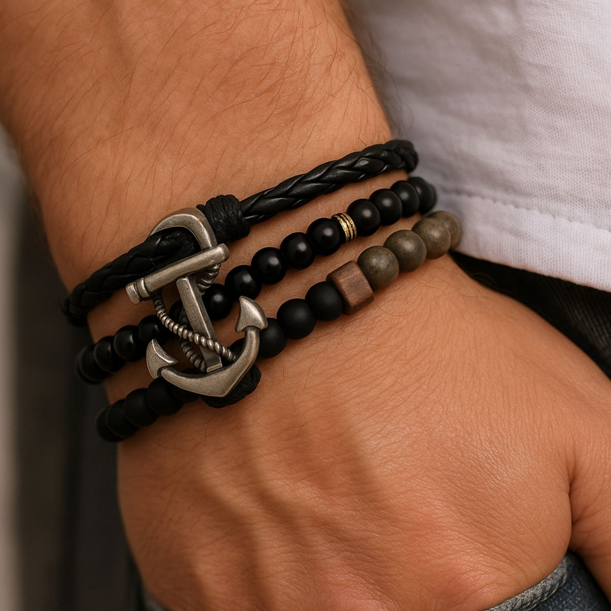 Premium Men's Anchor Charm Bracelet Stack – Black Leather & Beaded Nautical Wristwear