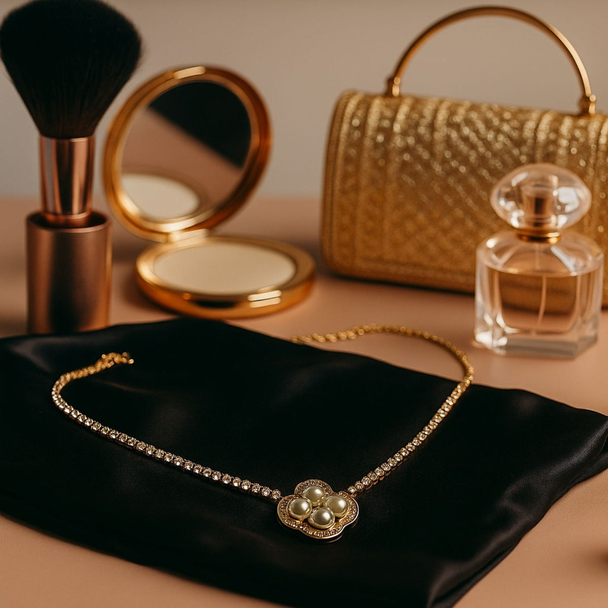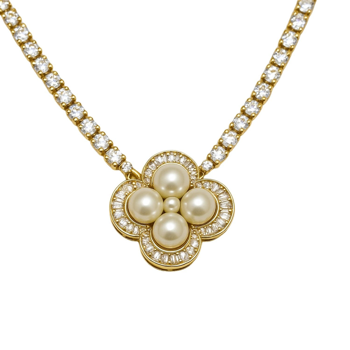 Floral-shaped pendant adorned with pearls and crystals on a sparkling gold-plated chain.
